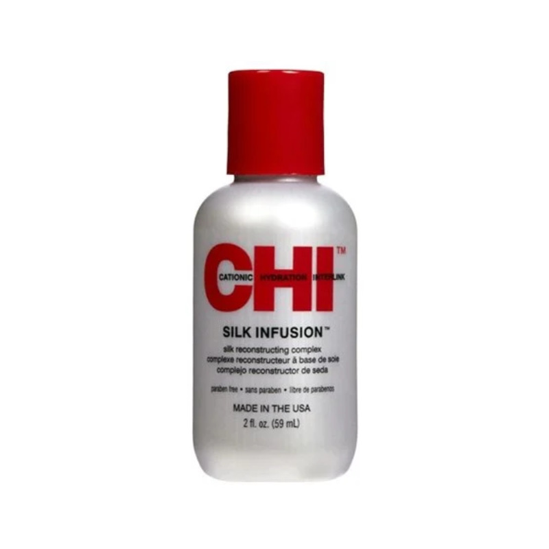 - Απλώστε μικρή ποσότητα CHI Silk Infusion στις παλάμες και εφαρμόστε ομοιόμορφα στα μήκη και τις άκρες.